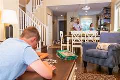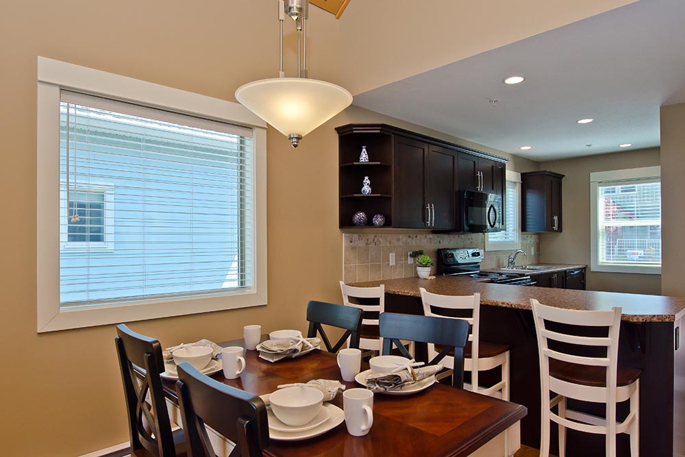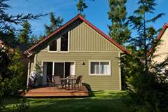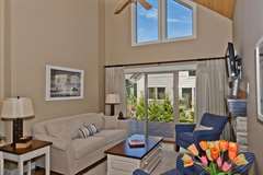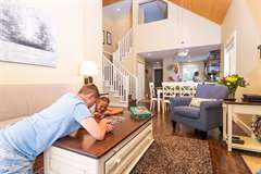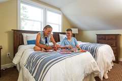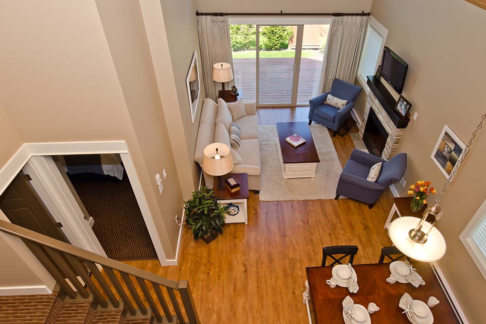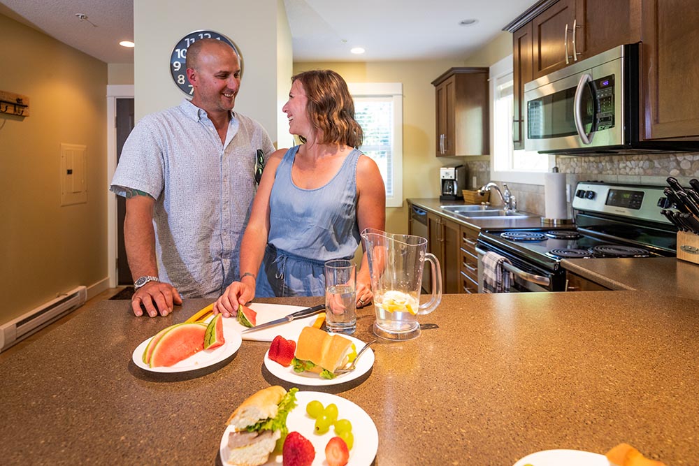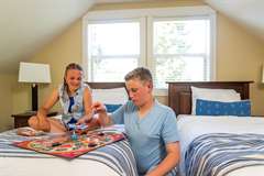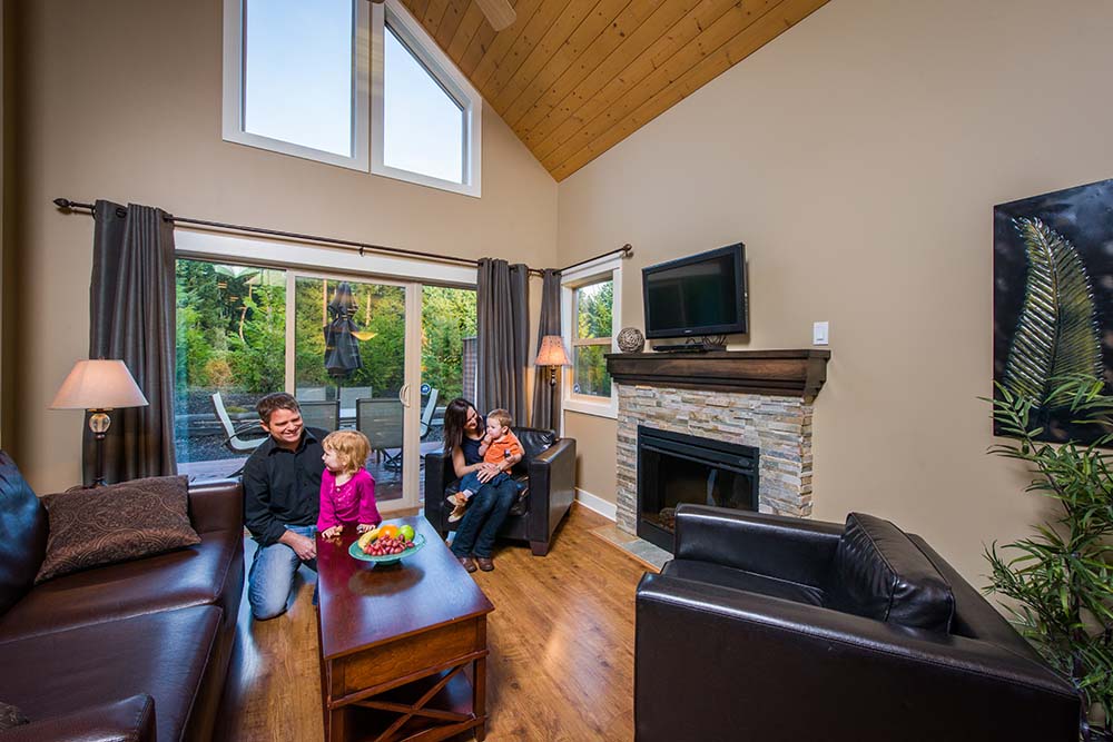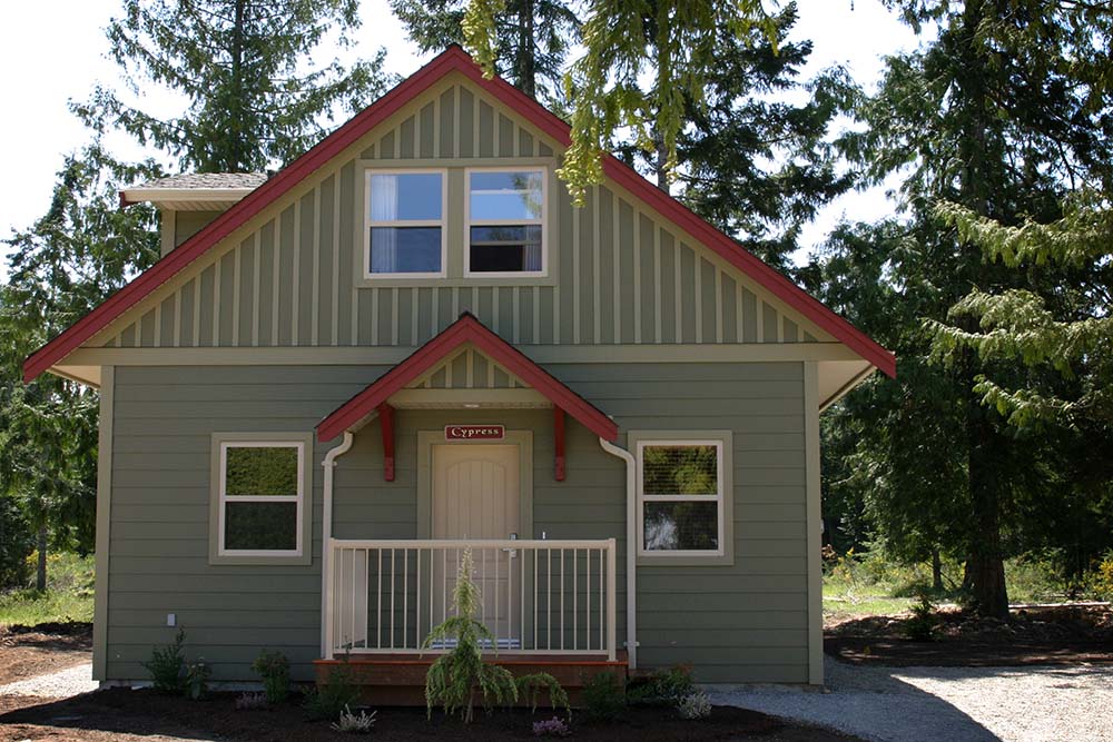 Step into the Cypress cottage rental and discover the perfect family getaway. This Parksville rental features two bedrooms, a loft and two full bathrooms, so there is plenty of space for family and friends to rest and play. From the loft you overlook the well-designed living area, which is outfitted with a cozy fireplace.